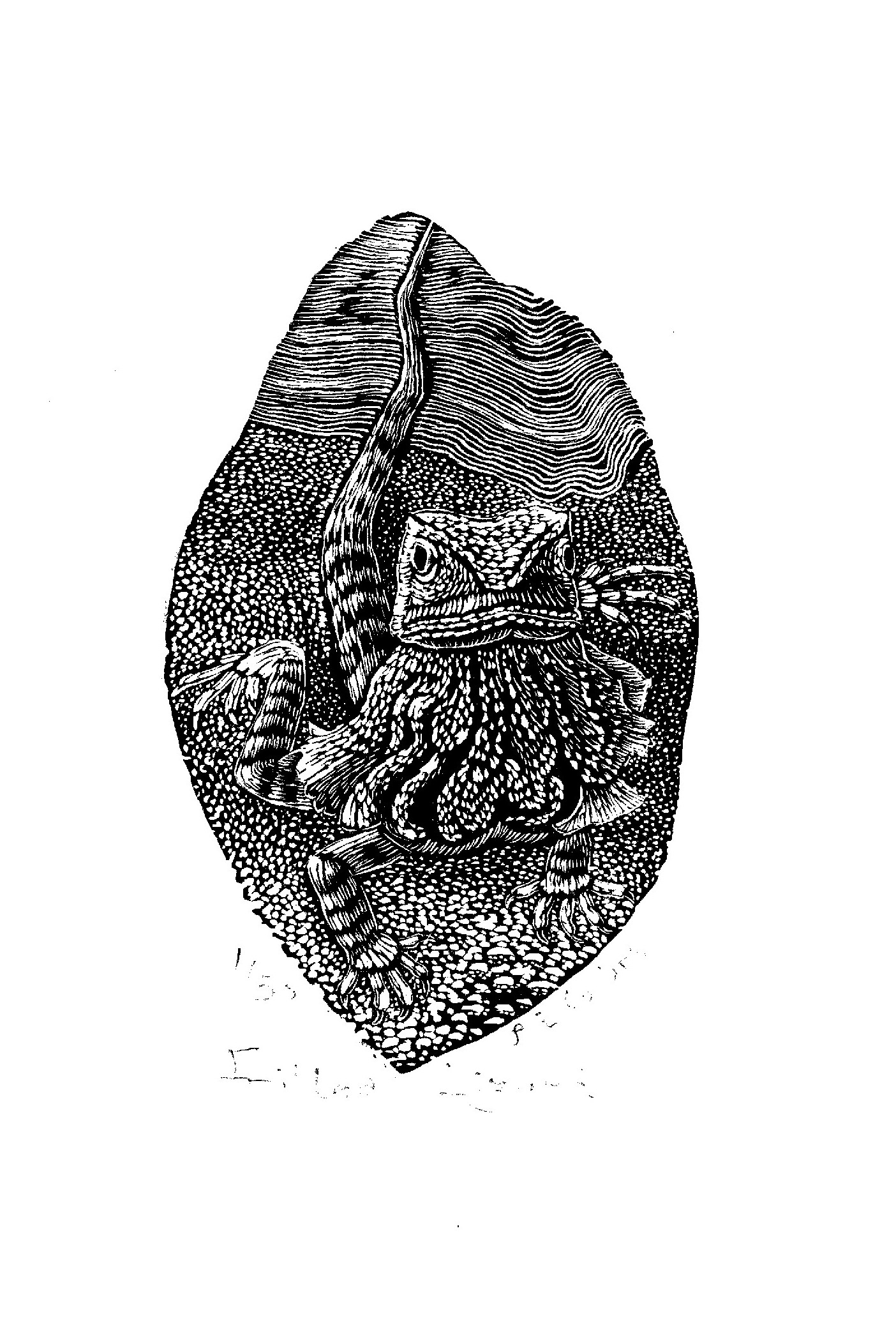 The Frilled Lizard in challenging stance. The boxwood offcut shape lends a “peephole” element to the design.