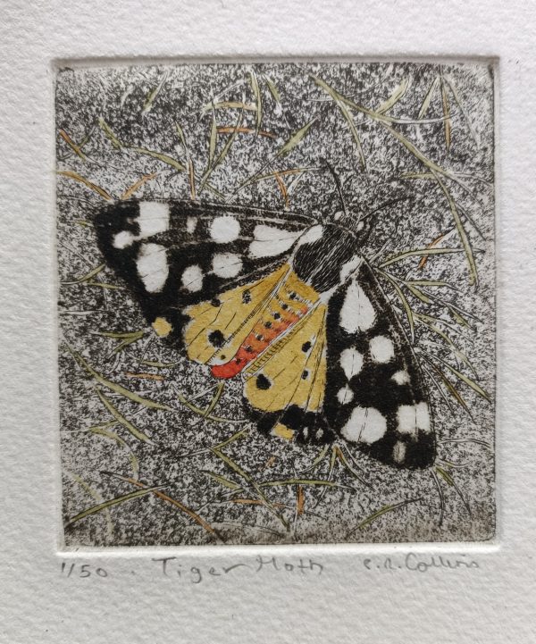 Engraving and etching on copper with hand colouring , 7x6cm, printed on Somerset printmaking paper.